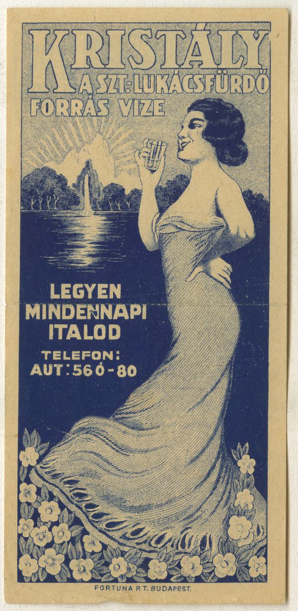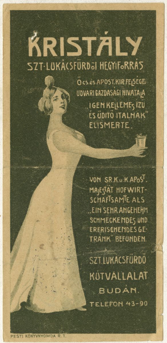 10. Kép: Szt Lukács fürdő hegyiforrás. Öcs. és apost. és kir. felsége udvari gazdasági hivatala "Igen kellemes ízű és üdítő italnak" elismert Von RS. K. u. Apos. Majästet Hofwitschaftsamte als "ein sehr Angehehm schmeckendes und erfirischendes getrank" befunden.Szt. Lukácsfürdő Kútvállalat Budán.Telefon: 43-90.