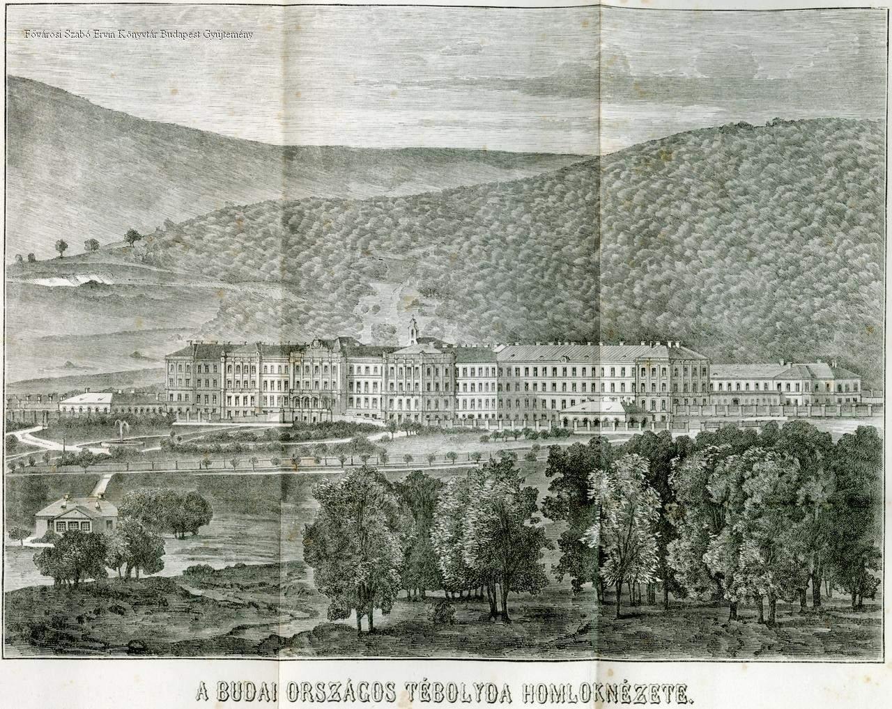 kórház, ideggyógyászat, elmegyógyintézet, látkép, homlokzat, park, erdő, domb, 1869