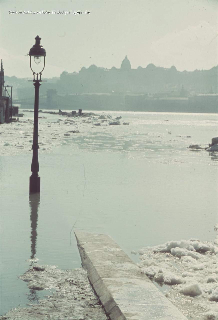 látkép, rakpart, parlament, árvíz, lámpaoszlop, hó, jég, tél, 1941?