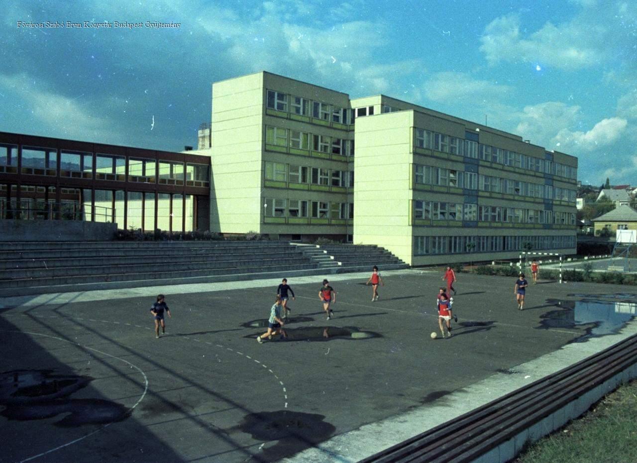 külső felvétel, épületkép, iskola, iskolaépület, gyermek, tanuló, labdarúgás, játék szabadban, 1980-as évek