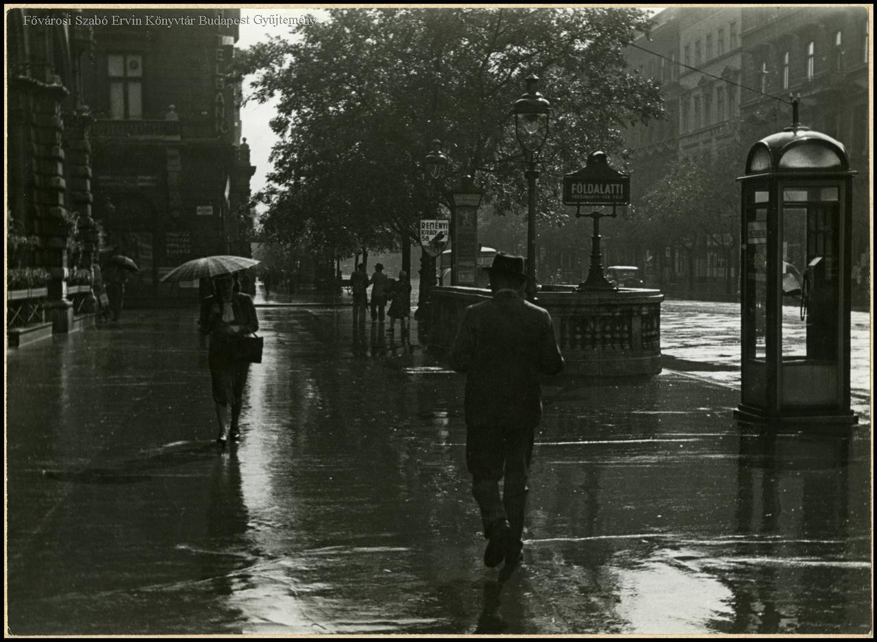 utcakép, eső, telefon, esernyő, földalatti vasút, hirdetés, 1942