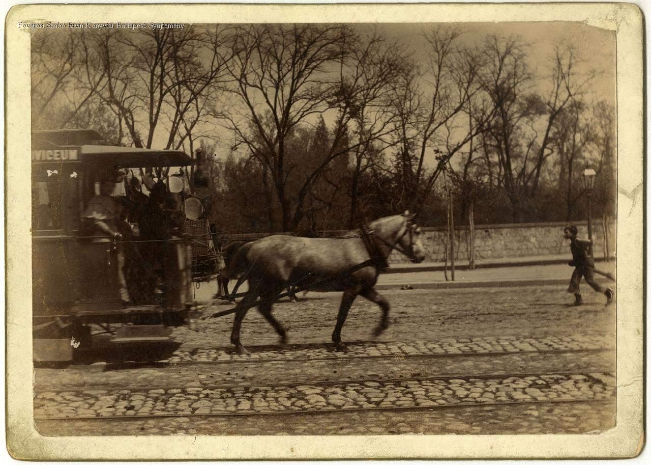 lóvasút, ló, vasúti sín, külső felvétel, utcakép, 1900-as évek, 1890-es évek