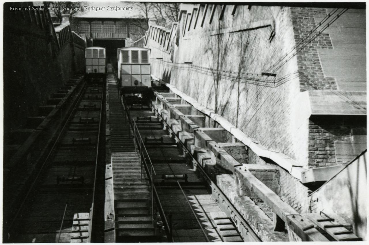 [A Sikló mindkét kocsija a pálya aljáról fényképezve]