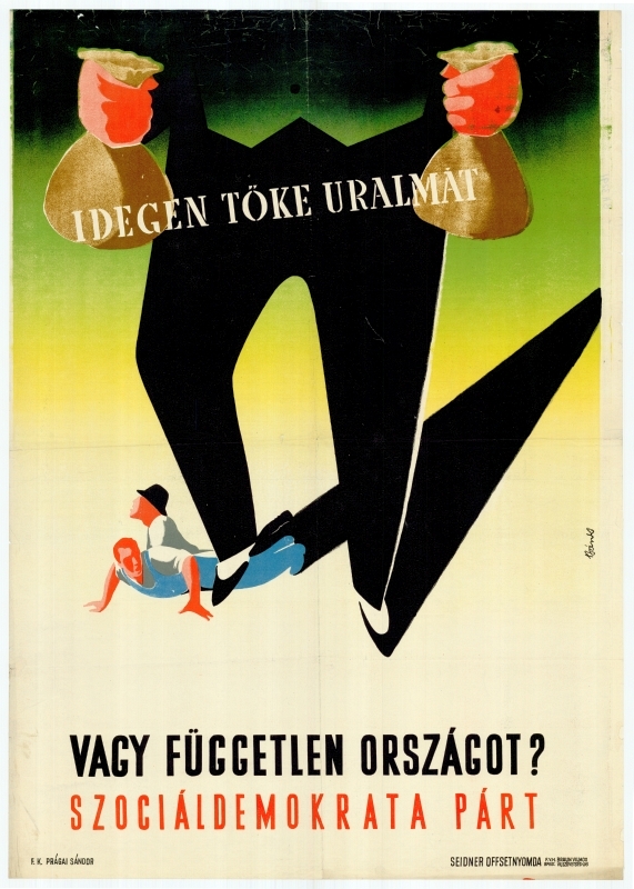 A Magyarországi Szoicáldemokrata Párt 1947-es grafikus jellegű propagandaplakátja. Egy arctalan alakot ábrázol, két zsákkal a kezében, aki két kisebb emberalakot tapos el. Az illusztráció és a plakát felirata együttesen utalnak a Magyarországi Szociáldemokrata Párt külföldi tőkét kiszorítani kívánó törekvéseire.