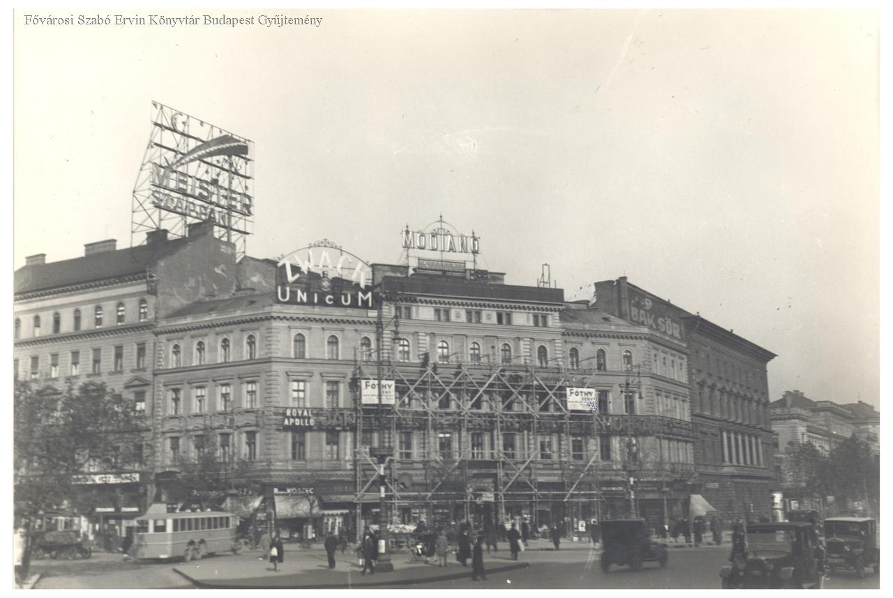 Autók, gyalogosok. Meister szappan, Modiano, Zwack reklámok. Az épület a második emeletig felállványozva, valószínűleg a fényreklámokat építik