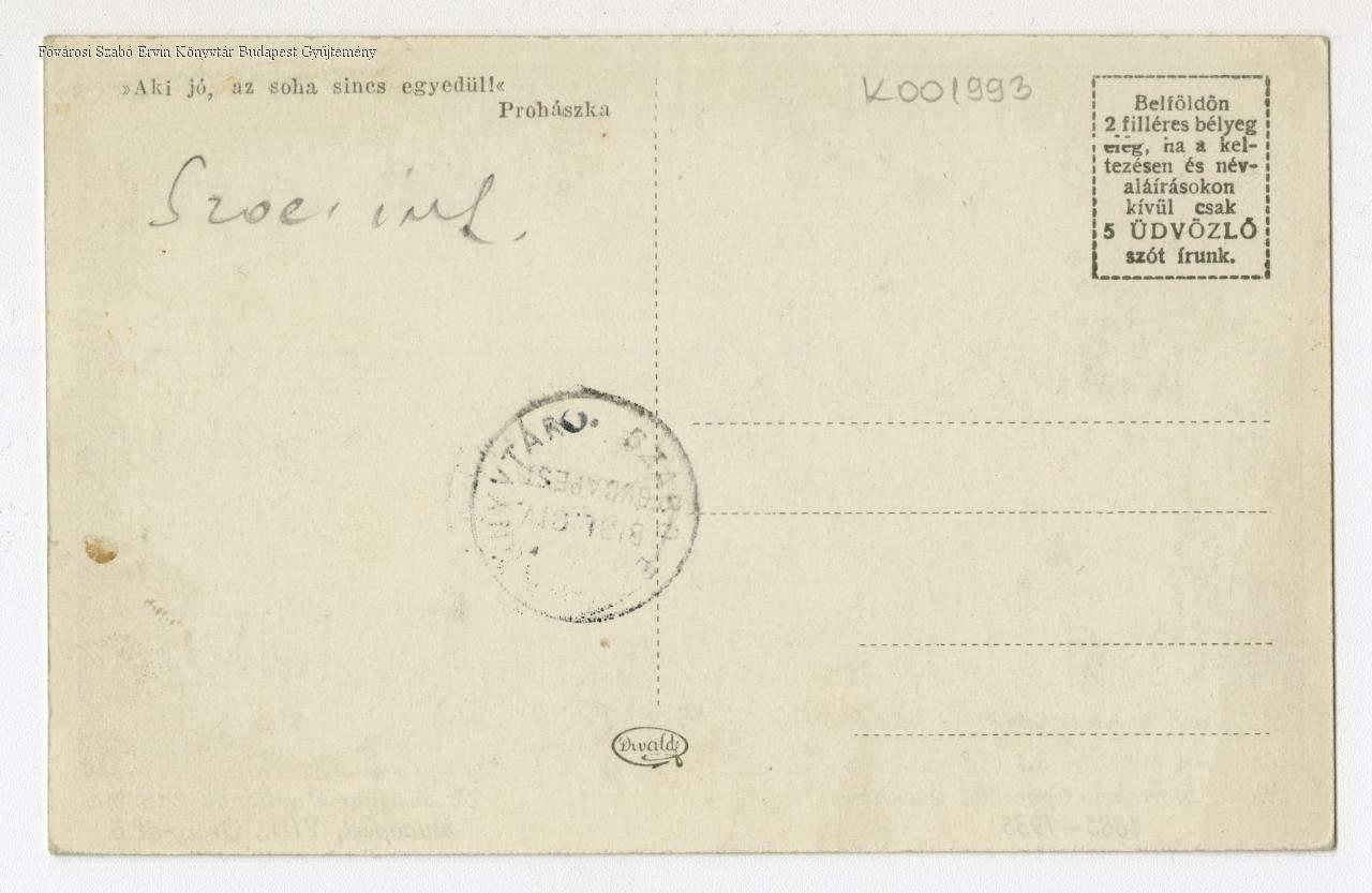 Hátlapon nyomtatva: "Aki jó, az soha sincs egyedül!" Prohászka