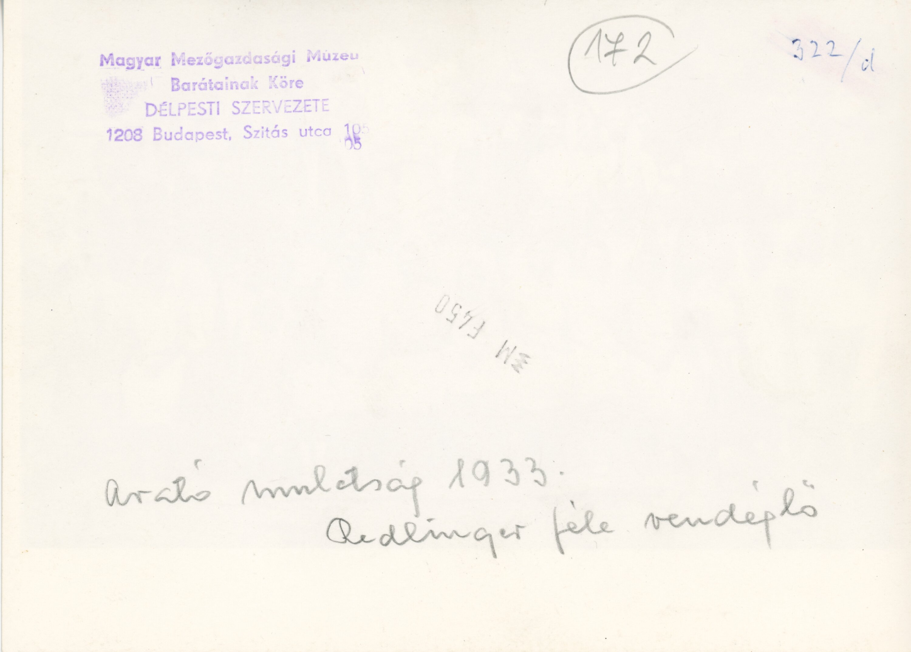 Arató mulatság 1933-ban, Redlinger-féle vendéglőben.Verso: Magyar Mezőgazdasági Múzeum Barátainak Köre, Délpesti Szervezete, 1208 Budaspest, Szitás utca 10.
