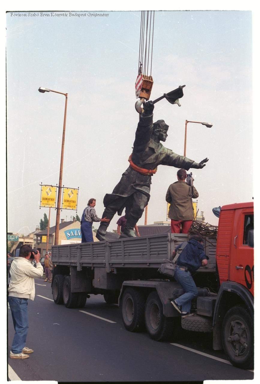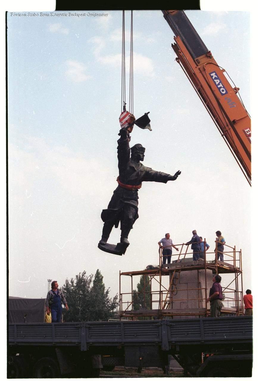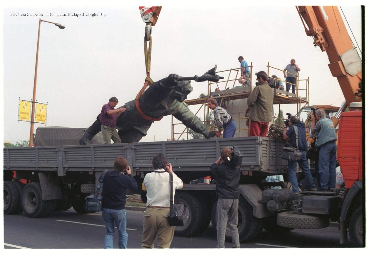 külső felvétel, eseménykép, szobor, szobordöntés, épületbontás, rendszerváltás, személygépkocsi, tehergépkocsi, szállítmányozás, ember, munkagép, emelőeszköz, 1990-es évek