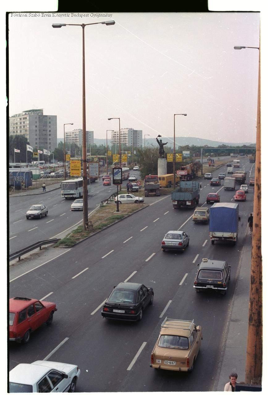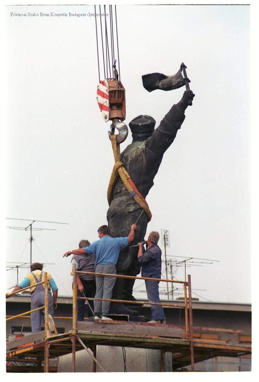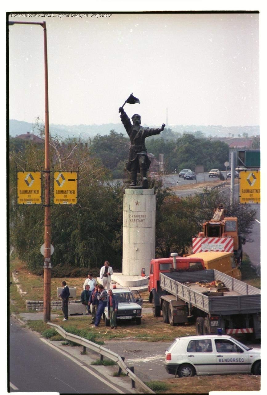 külső felvétel, eseménykép, szobor, szobordöntés, épületbontás, rendszerváltás, személygépkocsi, tehergépkocsi, szállítmányozás, ember, munkagép, emelőeszköz, 1990-es évek