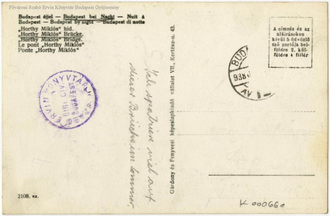 Budapest éjjel "Horthy Miklós" híd = Budapest bei Nacht : "Horthy Miklós" Brücke = Nuit a Budapest : Le pont "Horthy Miklós" = Budapest by night : "Horthy Miklós" Bridge = Budapest di notte : Ponte "Horthy Miklós"