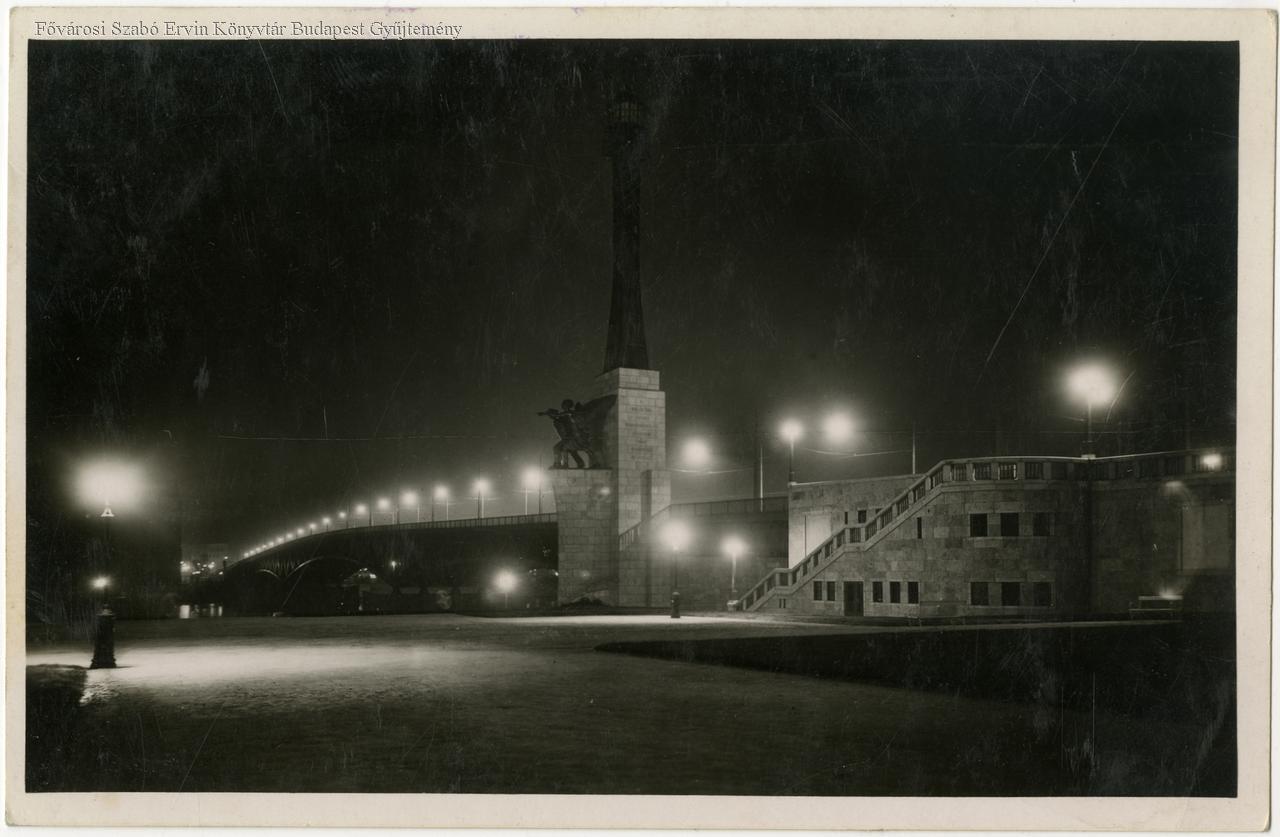 képes levelezőlap, híd, emlékmű, szobor, haditengerészet, hősiesség, este, 1938, Horthy-korszak
