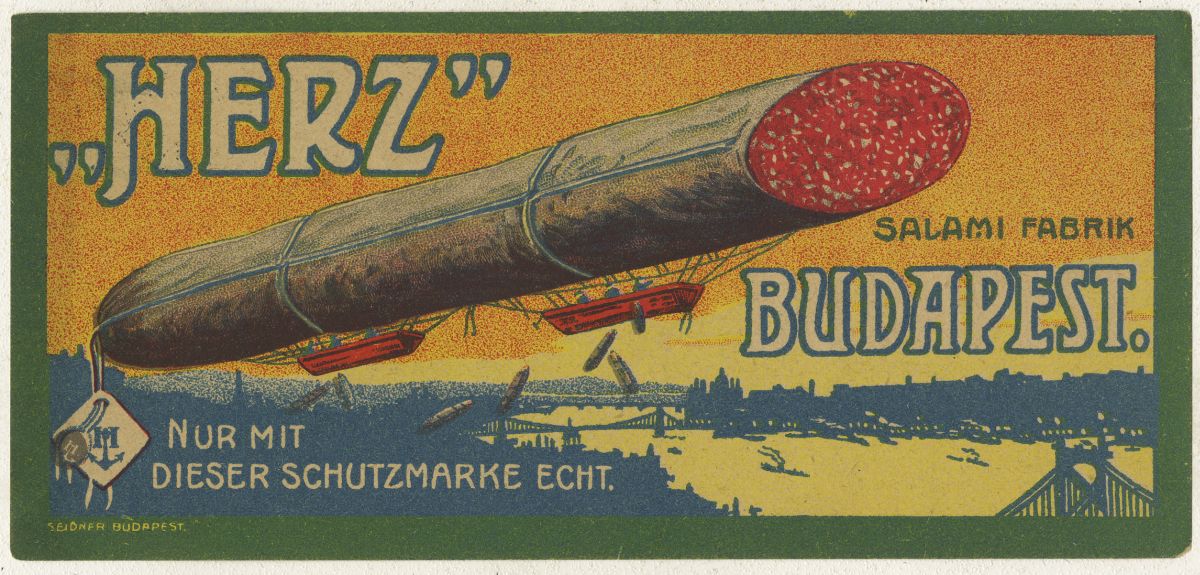 Budapest, látkép, léghajó, szalámi, rúd, reklámnyomtatvány, kisnyomtatvány, aprónyomtatvány, számolócédula