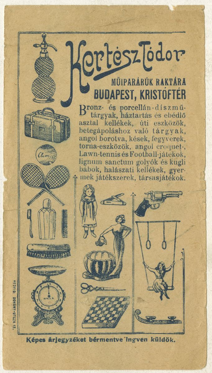 Kertész Tódor sport., díszmű-, játékáruk, utazási, háztartási cikkek, Budapest, Kristóf tér.