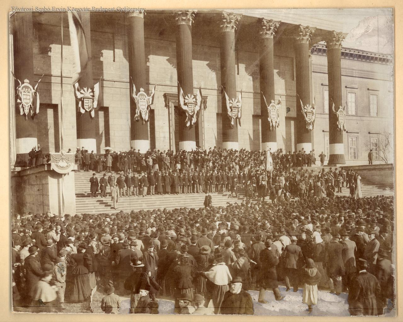 [A szabadságharc félévszázados emlékünnepsége a Múzeum-kertben, tömegjelenet a múzeum lépcsőjénél]