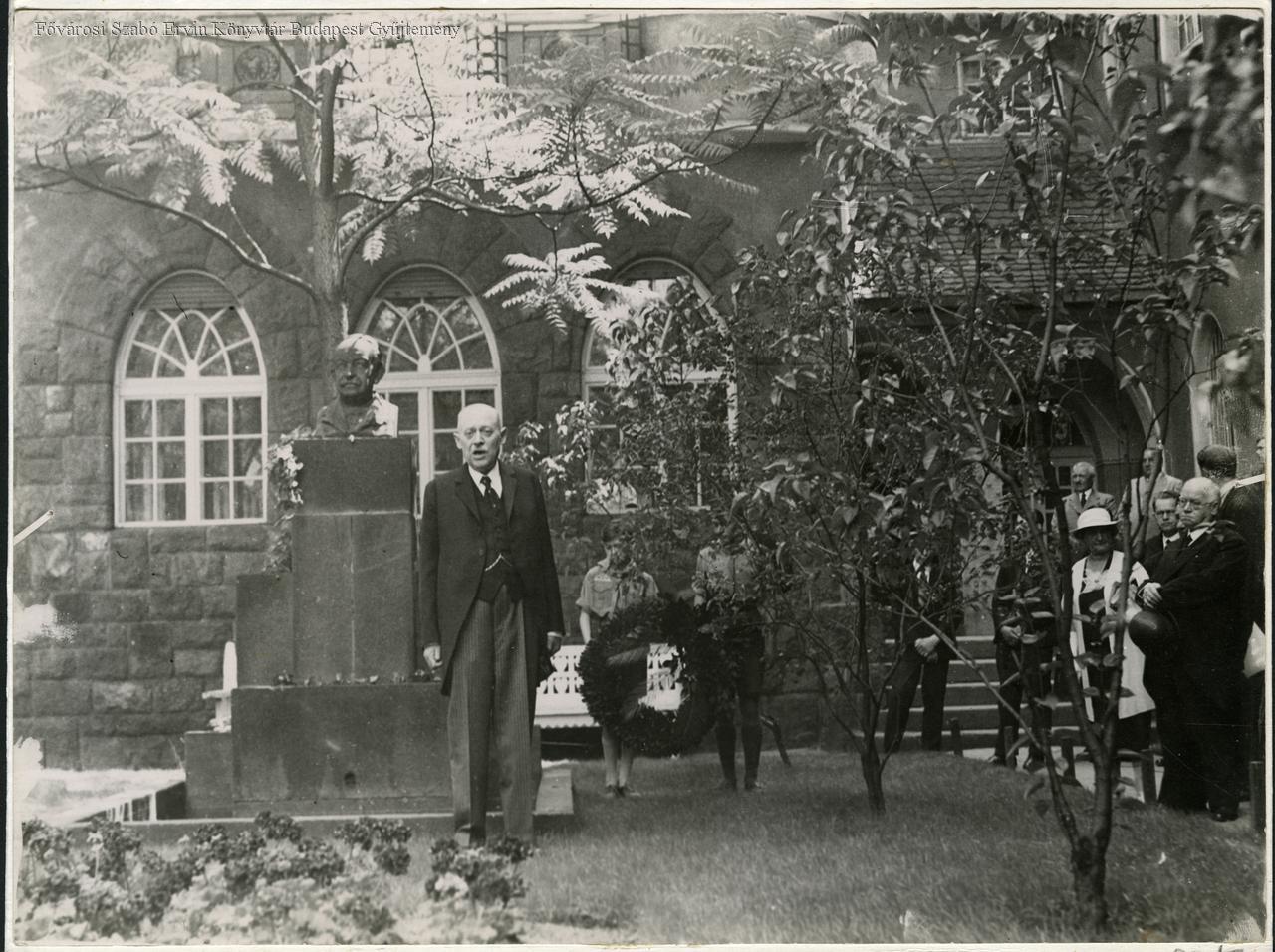 [Emlékünnepség a Fasori református templom kertjében Laky Adolf szobránál] [Nádas Gyula gondnok beszél a mecénás mellszobra előtt]