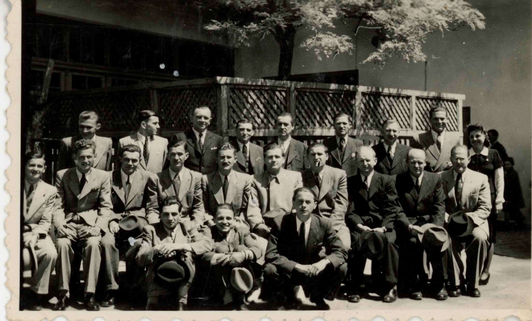 férfiak; csoportkép; Vörösmarty Kör; Soroksár; 1943; vendéglő; Holbing; udvar; kültéri felvétel