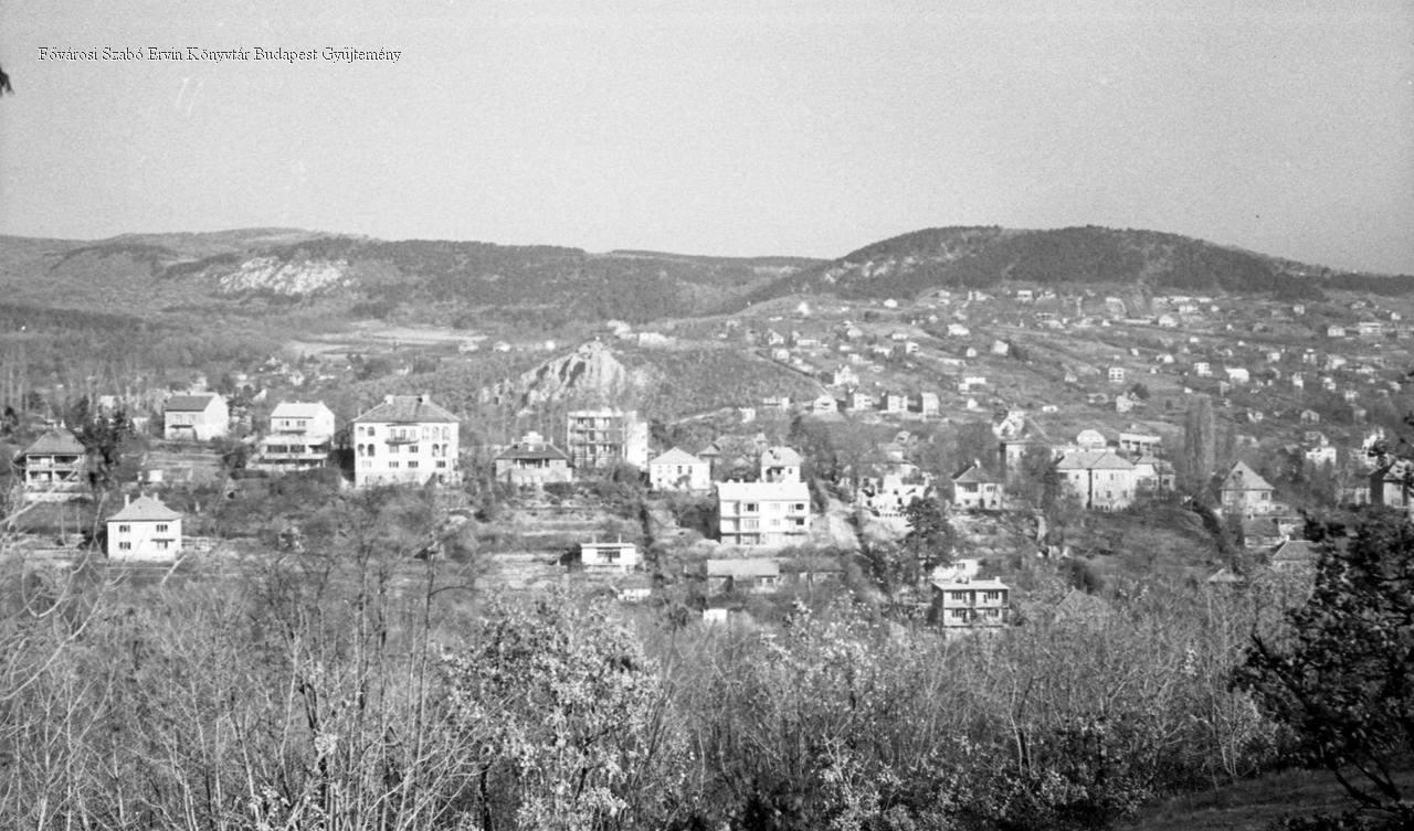 [Budai látkép a Hűvösvölgy felé a Libegő felső állomásánál a kilátóteraszról, az Apáthy-szikla és a Hármashatár-hegy felé]