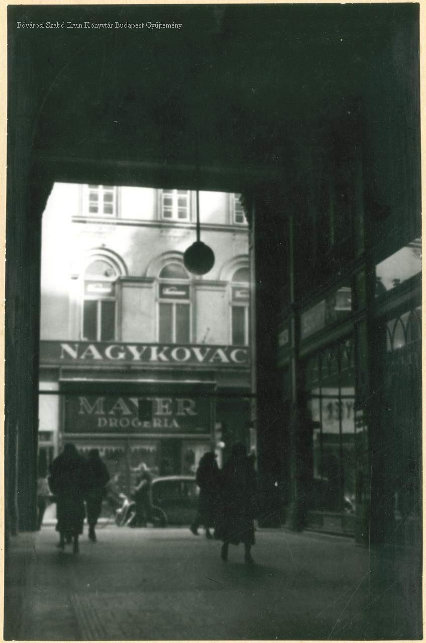 Az átjáróház kijáratánál a Mayer drogéria portálja látszik