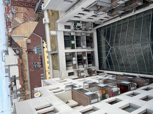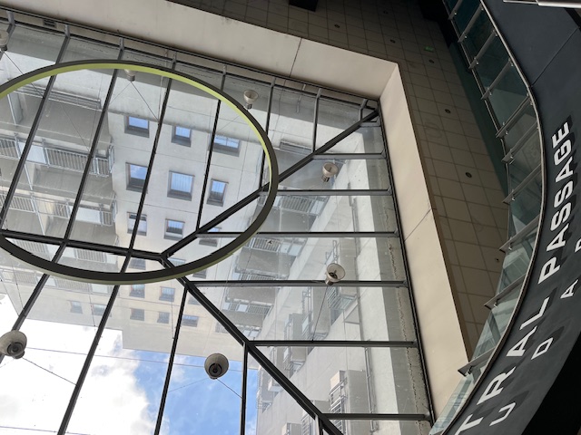Megjegyzem, előnyös lett volna több zöldfelületet kialakítása, mely kissé ellensúlyozná a Király utca „szürke” hangulatát. Ugyanakkor kifejezetten nyomasztó maga az átjáró bal oldalán épült kilenc szintes, hétemeletes, monstrum társasház, melyhez az A, B, C, D épületek tartoznak. Nem kelt kellemesebb impressziót az átjáró jobb oldalára épített Paulay Ede 3. számú – a társasházhoz tartozó E lépcsőház sem, mely háromemeletes.