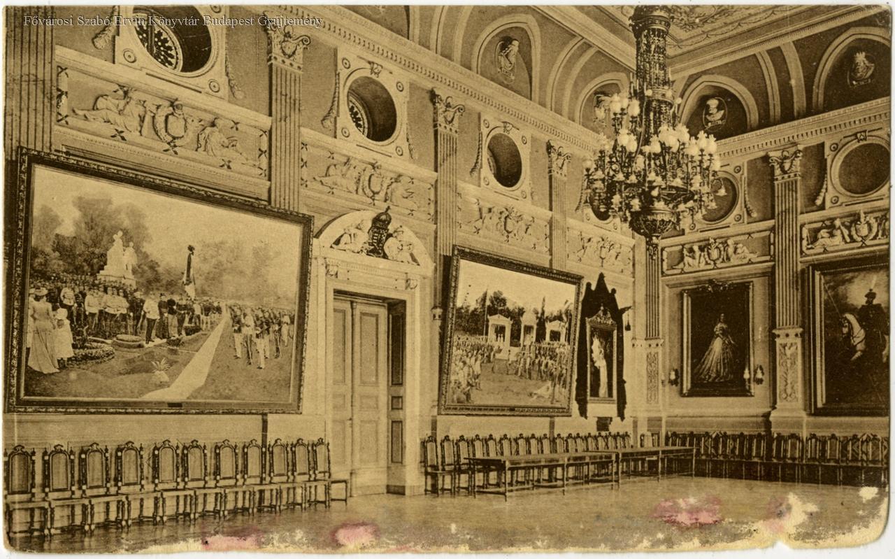 A szobordíszekkel dúsan borított falakon nagyméretű festmények I. Ferenc József király és Erzsébet királyné ábrázolásaival. Erzsébet királyné portréjét Kovács Mihály készítette.
