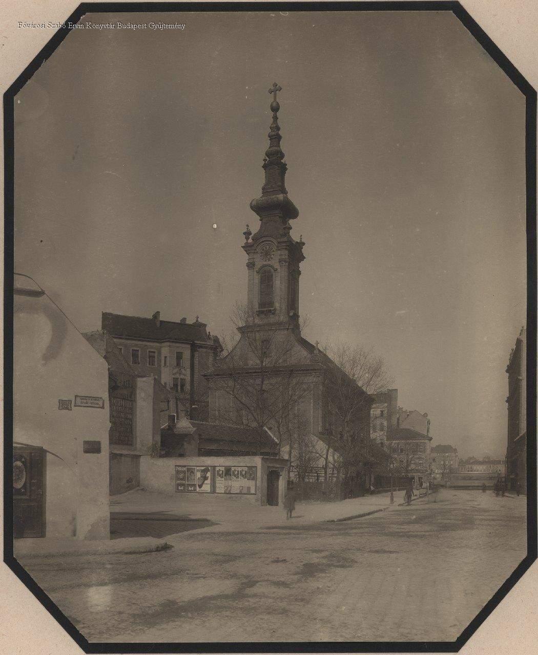 A templom tágabb környezetével, előtérben az Árok utca 62. sz. ház sarka. Jobbra, az utca végén a Döbrentei tér. A templom előtti udvarban (a plakátokkal borított fal mögött) Avar László vendéglője, mögötte, a kis földszintes épületben Badovins(z)ky Pál fényképészműterme. A Hadnagy utcában 1914-ben fektették csak le a villamossíneket.