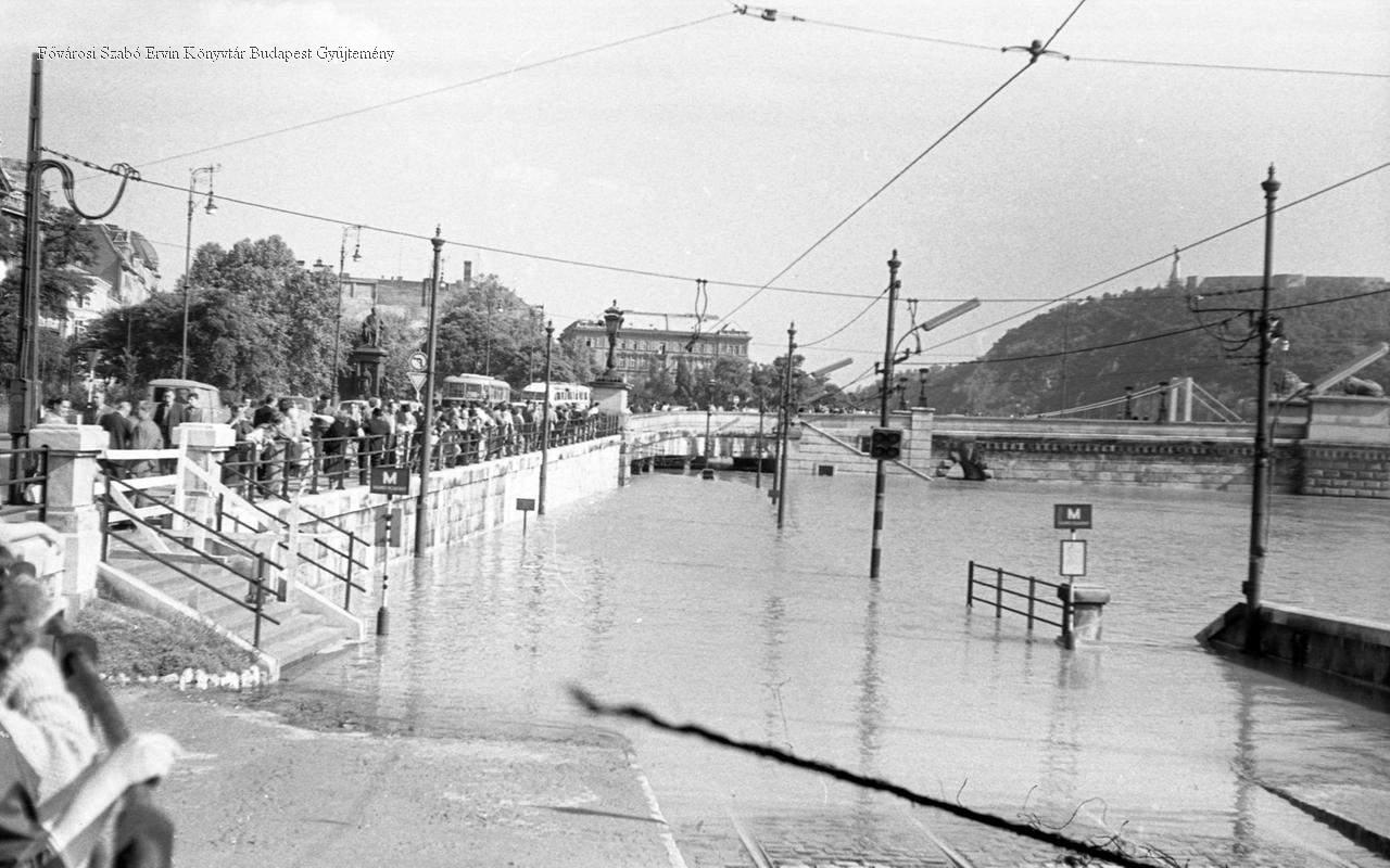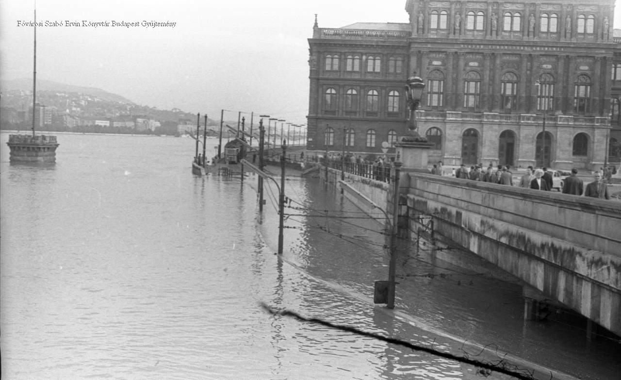 külső felvétel, eseménykép, ember, árvíz, közúti villamos, villamosmegálló, 1960-as évek