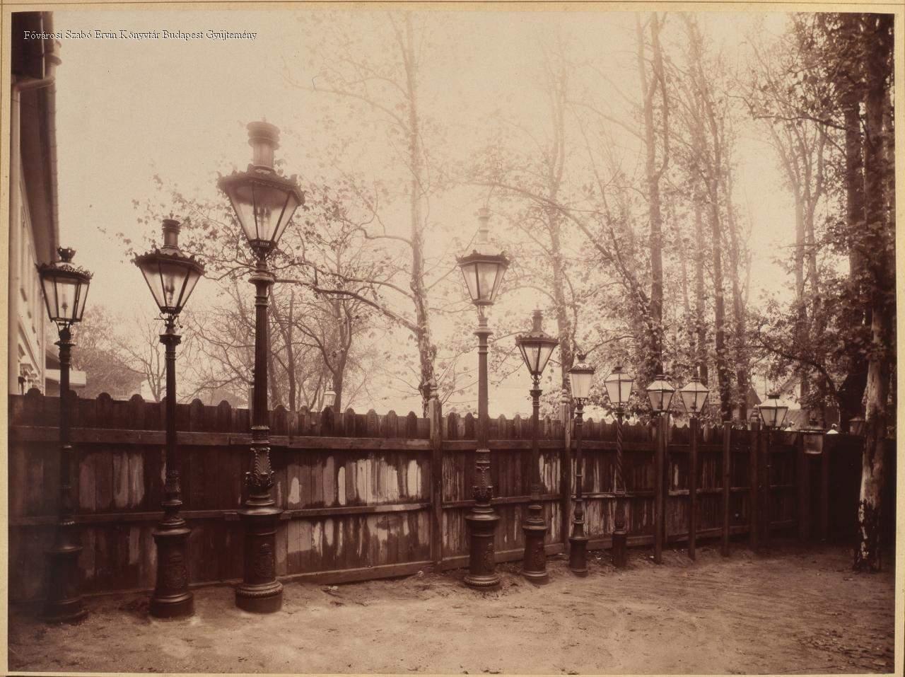 Ismeretlen helyen készült felvétel. Épületudvar fakerítése mentén bemutató-jelleggel elhelyezett különböző méretű utcai lámpák, kandeláberek. A kerítésen túl épületek, nagyobb fák