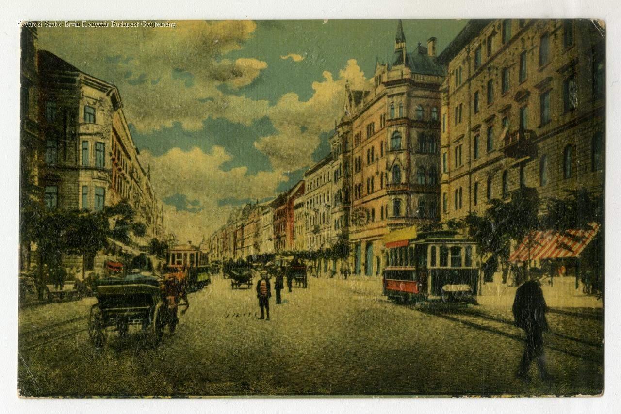 lakóépület, palota, fogat, villamosközlekedés, közúti villamos, ember, képes levelezőlap, külső felvétel, látkép, utcakép, 1920-as évek