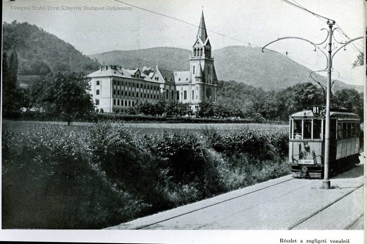 Háttérben az Angolkisasszonyok zárdája és temploma, előtérben 81-es villamos