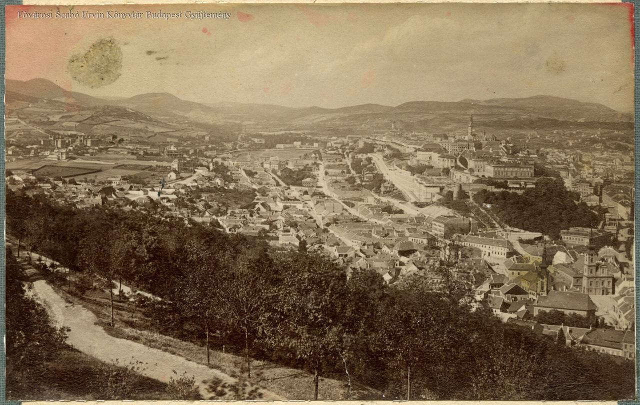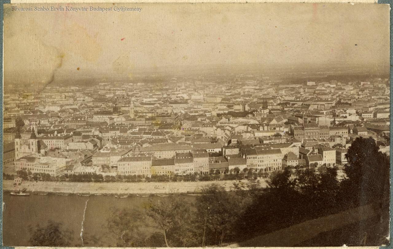 [Pest és Buda látképe a Gellérthegyről, háttérben az épülő Országház]