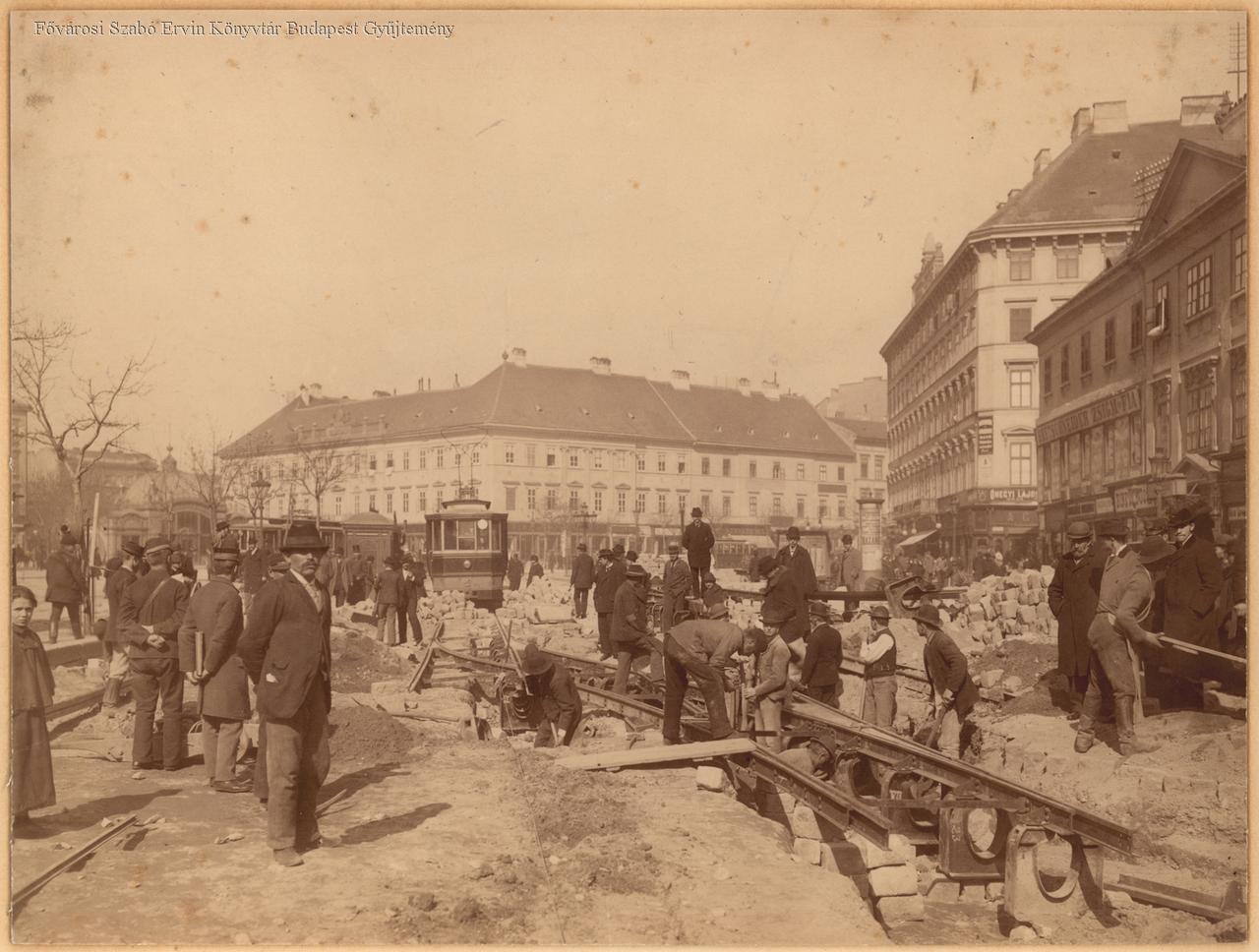 vasúti pálya, közúti villamosvasút, sín, munkás, építés, férfi, munkavégzés, hirdetőoszlop, villamos kocsi, bérház, utcakép, jelenet, 1890-es évek