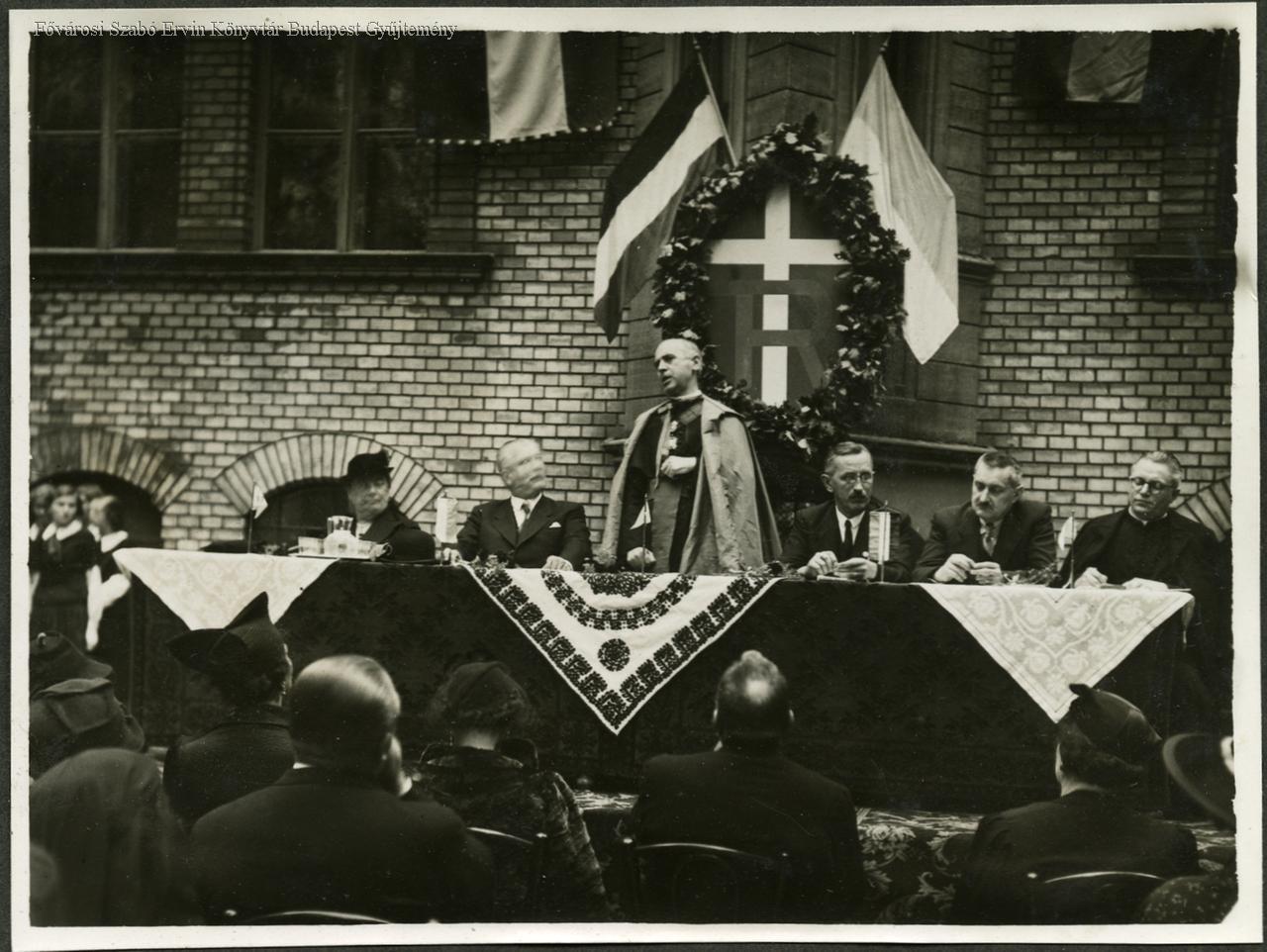 egyházi iskola, római katolikus egyház, vincés irgalmas nővérek, középfokú oktatás, nőképzés, szakképzés, avatás, ünnepség, beszéd, egyházi személy, kereszt, zászló