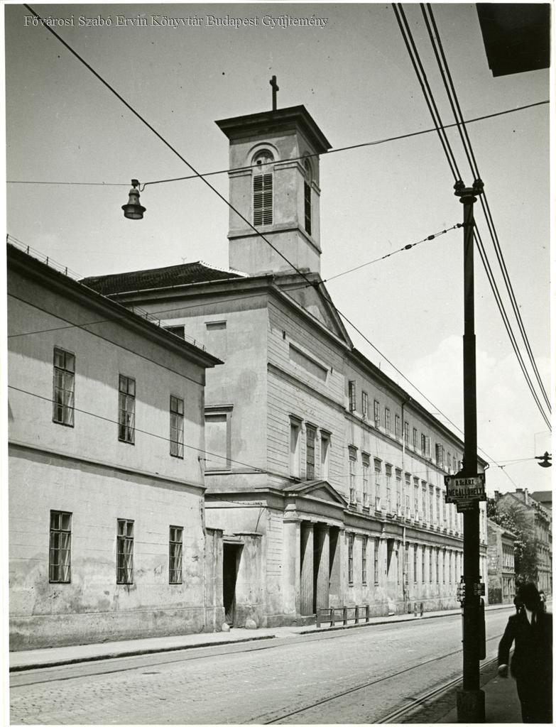 épületkép, kápolna, katolikus egyház, betegápolás, szerzetesrend, kórház, lakóház, utcakép, villamosmegálló, 1920-as évek