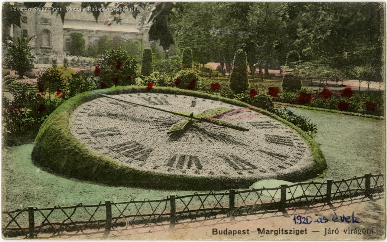 képes levelezőlap, park, dísznövény, köztéri óra, 1910-es évek