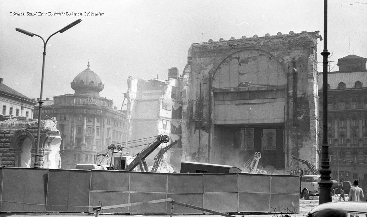 külső felvétel, épületkép, utcakép, színház, ember, épületbontás, robbantás, személygépkocsi, munkagép, 1960-as évek