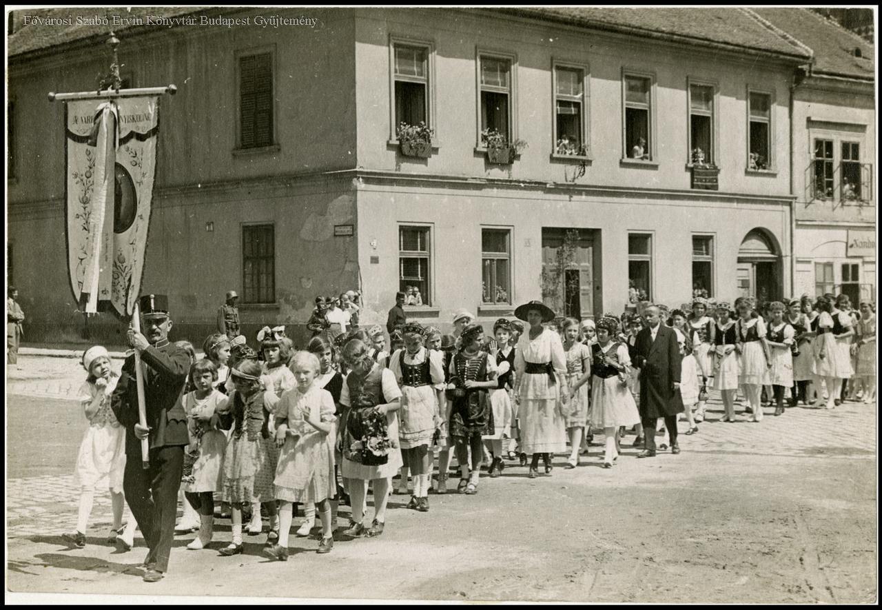 általános iskola, népviselet, népiesség, felvonulás, zászló, tanuló, pedagógus, lakóépület, 1920-as évek