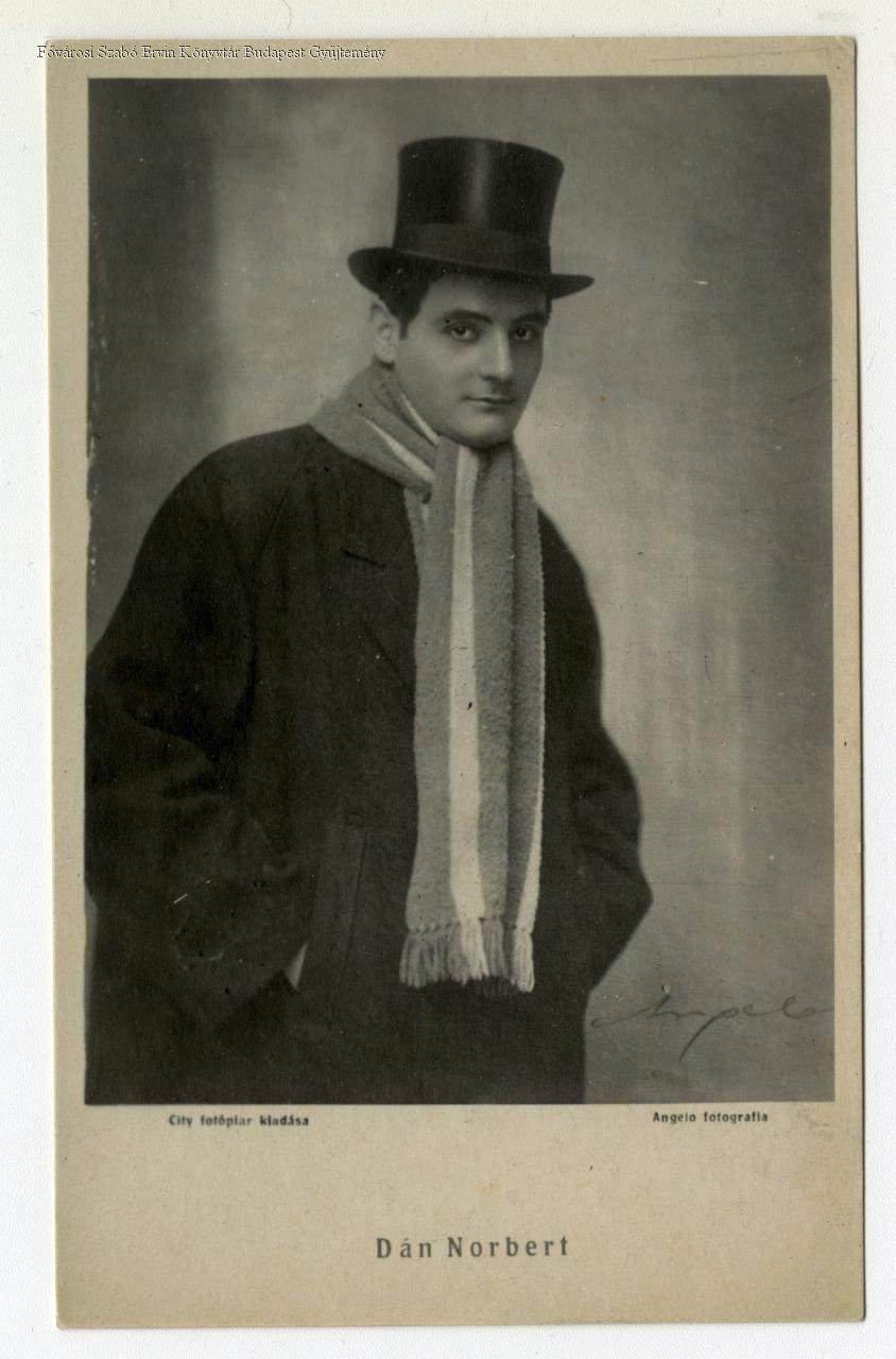 képes levelezőlap, műtermi portré, színész, férfi, színházi jelmez, film, kalap, cilinder, sál, derékkép, 1910-es évek
