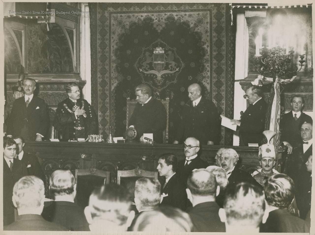főpolgármester, polgármester, alpolgármester, önkormányzati képviselő, helyi politika, politikus, férfi, beiktatás, eskütétel, ünnepség, ünneplőruha, díszmagyar, címer, zászló, sajtófotó, eseménykép, Horthy-korszak, 1931