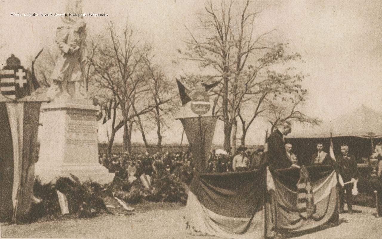 A szobor előtt az emelvényen a szónok, háttérben a közönség. Istók János első világháborús emlékműve. Álmos vezér tér