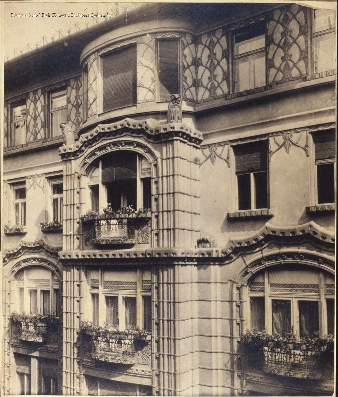 homlokzat, szecesszió, bérház, épületdísz, szobor, erkély, vasművesség, épületkép, külső felvétel, 1908 után