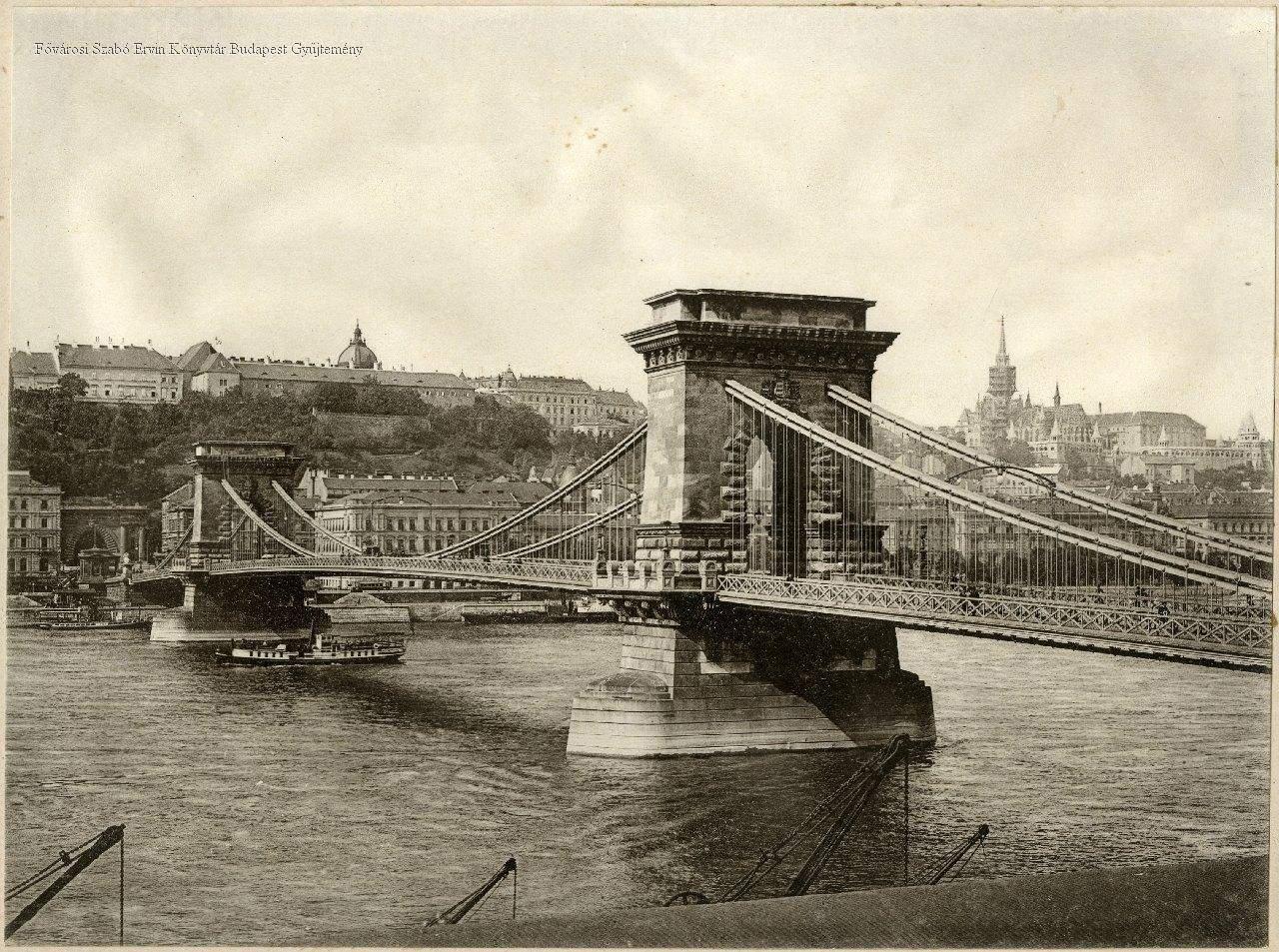 Háttérben a budai oldal, a Vár és az újjáépítés alatt álló Mátyás-templom. A Dunán propeller (átkelőhajó, csavargőzös, propeller ).