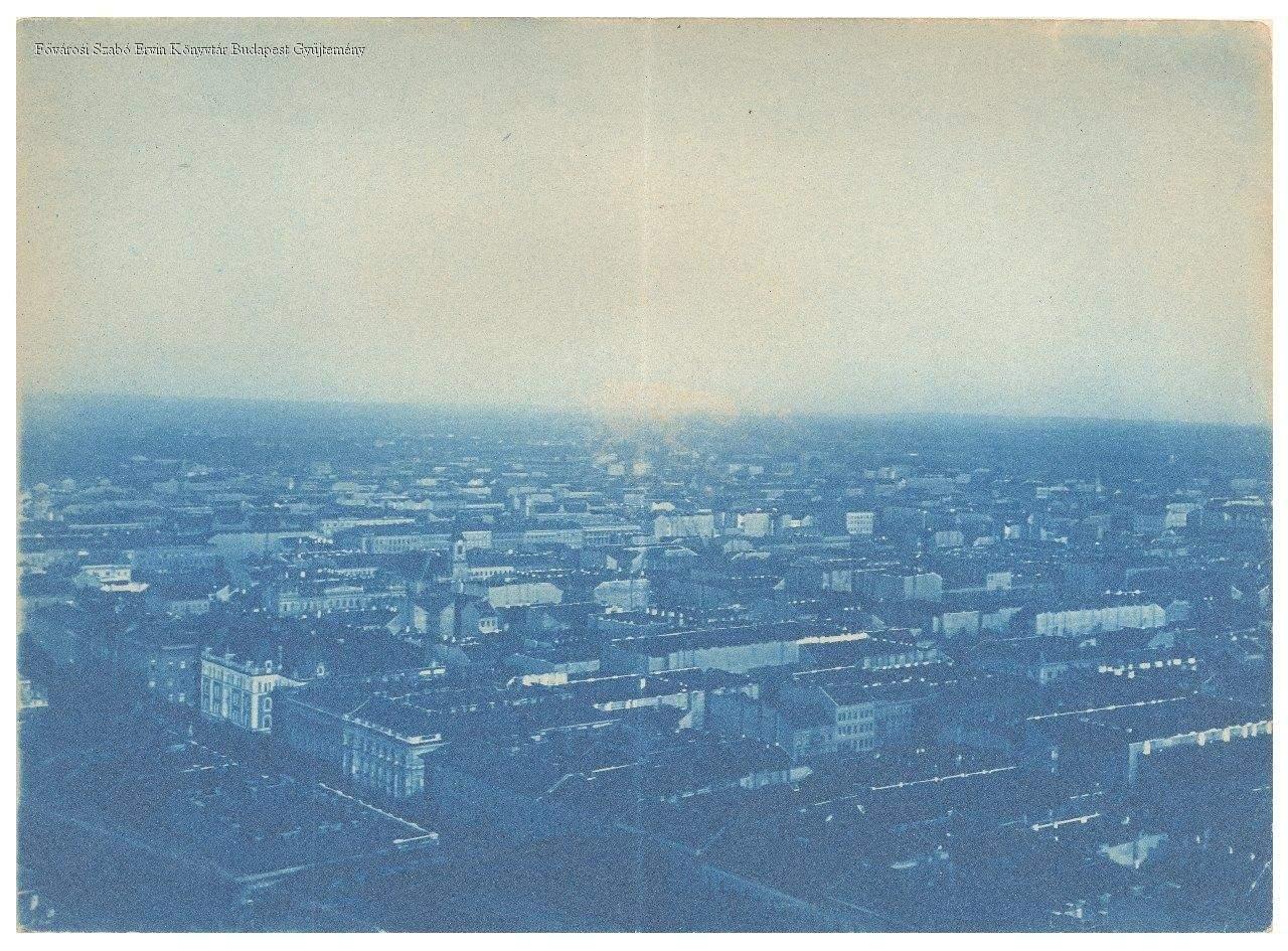 Erzsébetvárosi látkép. Előtérben az Andrássy út házai, távolabb átlósan a Nagykörút vonala (még foghíjtelkekkel)