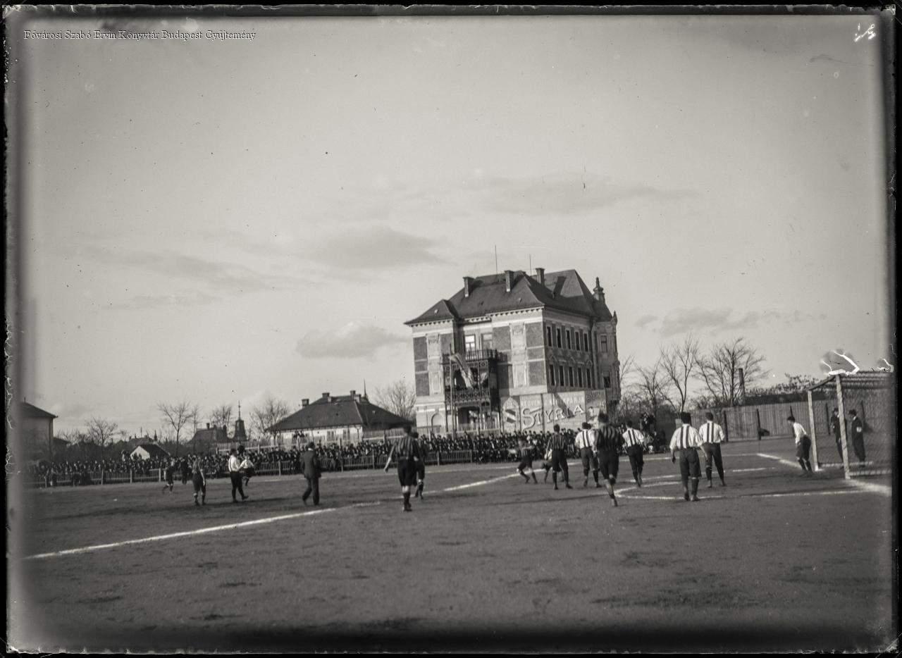 [Futballozók a millenáris pályán, háttérben a Stefánia út] [Footballers on the Millennium Field, Stefánia Road in the background]