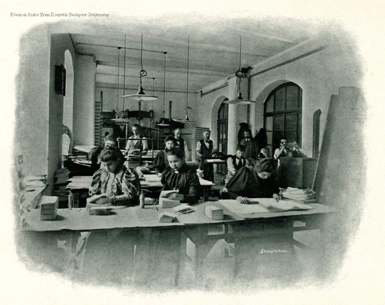 nyomdaipar, munkavégzés, könyvkötészet, belső felvétel, 1898