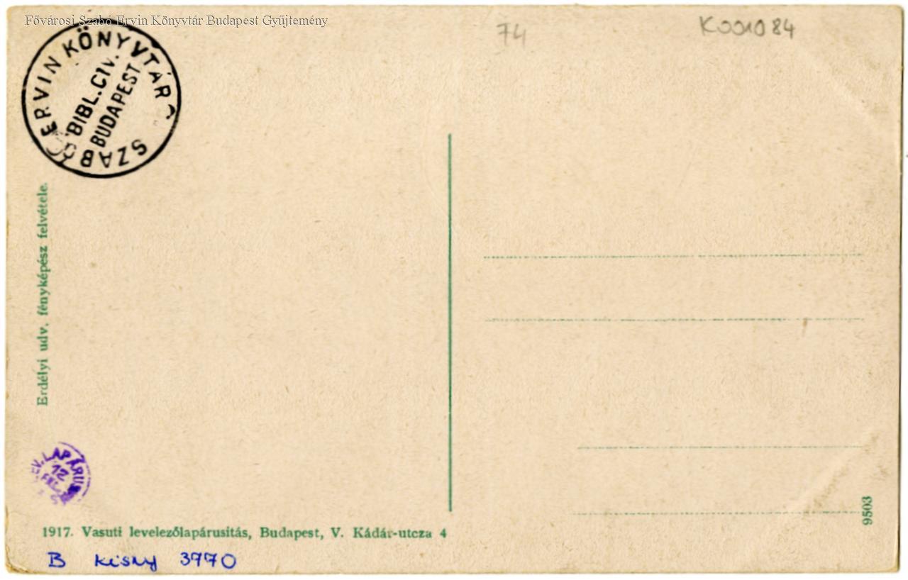 Vasúti levelezőlapárusítás, Budapest, V. Kádár-utcza 4. ; sorozati szám: 9503