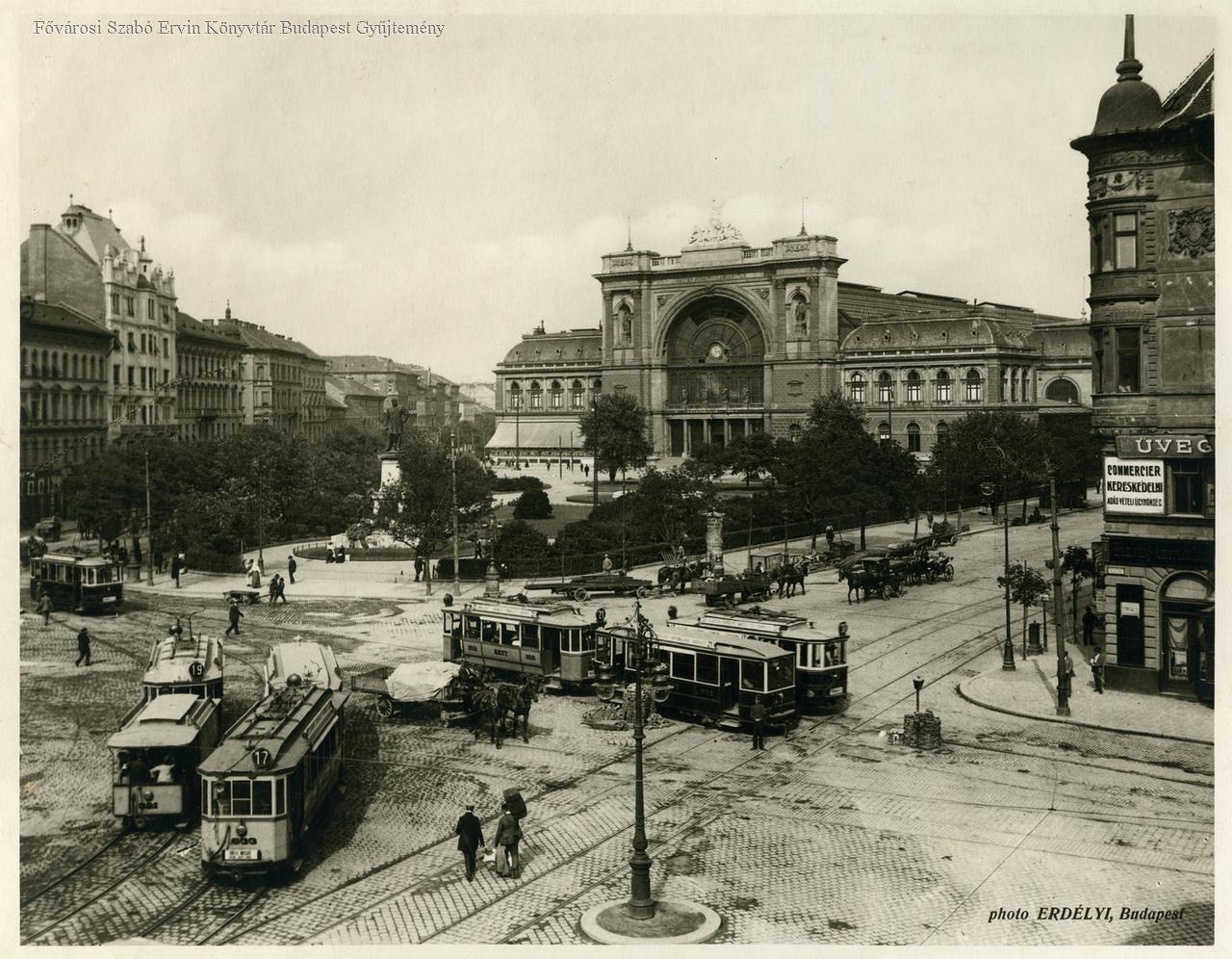 utcakép, pályaudvar, emlékmű, park, villamos kocsi, lovas kocsi, közvilágítás, útburkolat