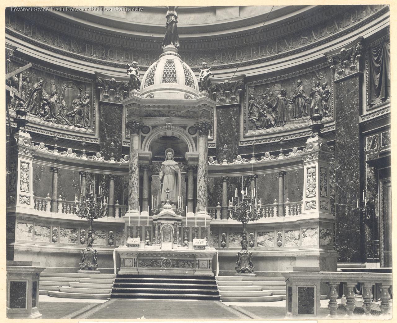 [Bazilika főoltára Szent István szobrával és az István király életét ábrázoló domborművekkel]