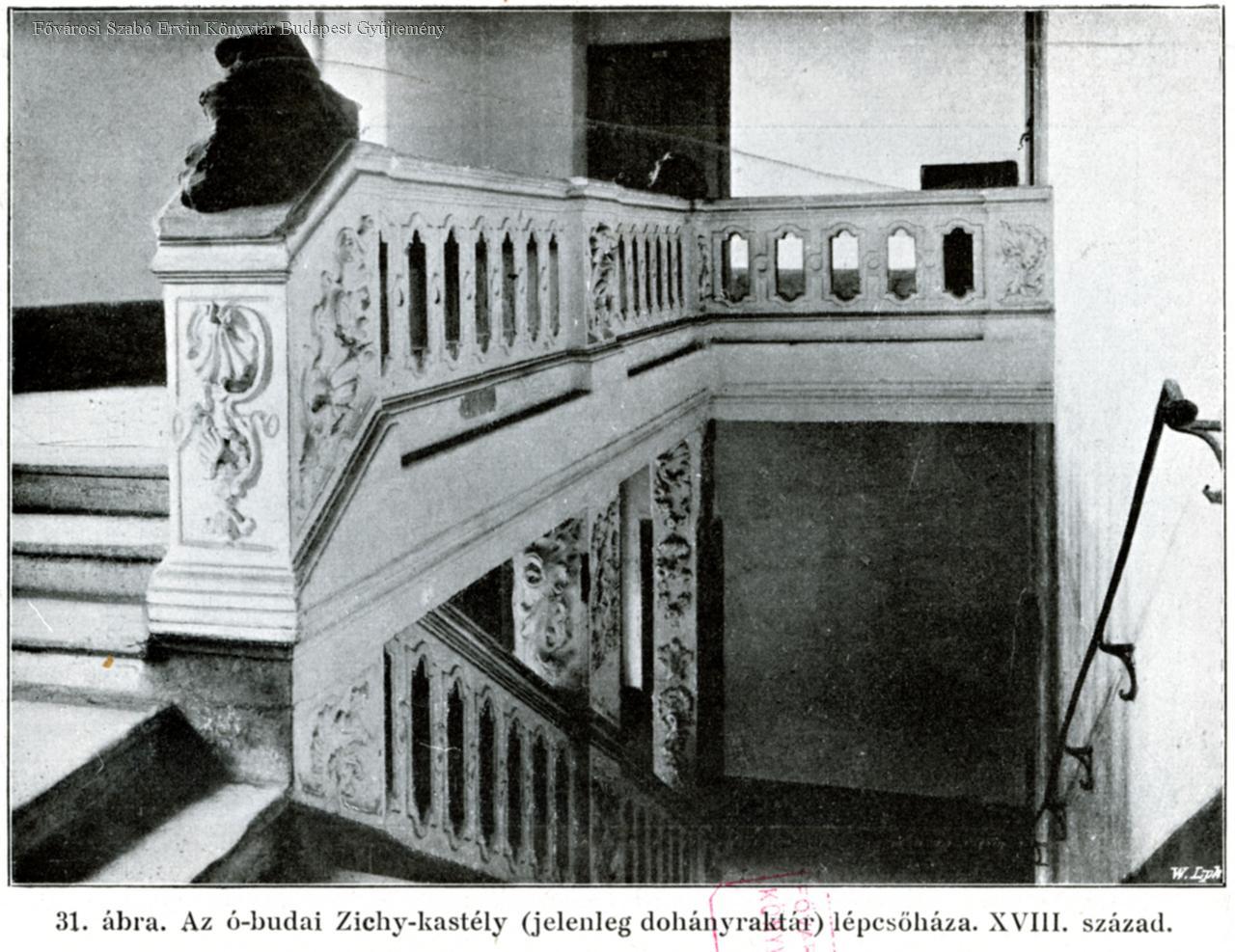 1911-ben dohányraktár. Lépcsőház, faragványos pillér