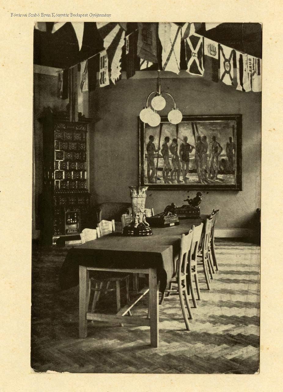 sportszövetség, sport, evezősport, közintézmény, igazgatási létesítmény, közösségi létesítmény, terem, kályha, zászló, bútor, szobor, festmény, serleg, képes levelezőlap, 1930-as évek