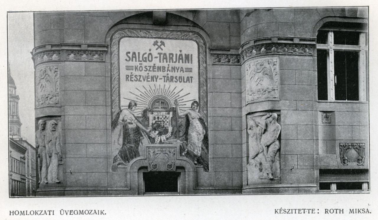 irodaház, homlokzat, lépcsőház, épületdíszítés, mozaik, épületszobrászat, kovácsolt vas, vasművesség, kapu, csillár, külső felvétel, belső felvétel, alaprajz, 1900-as évek
